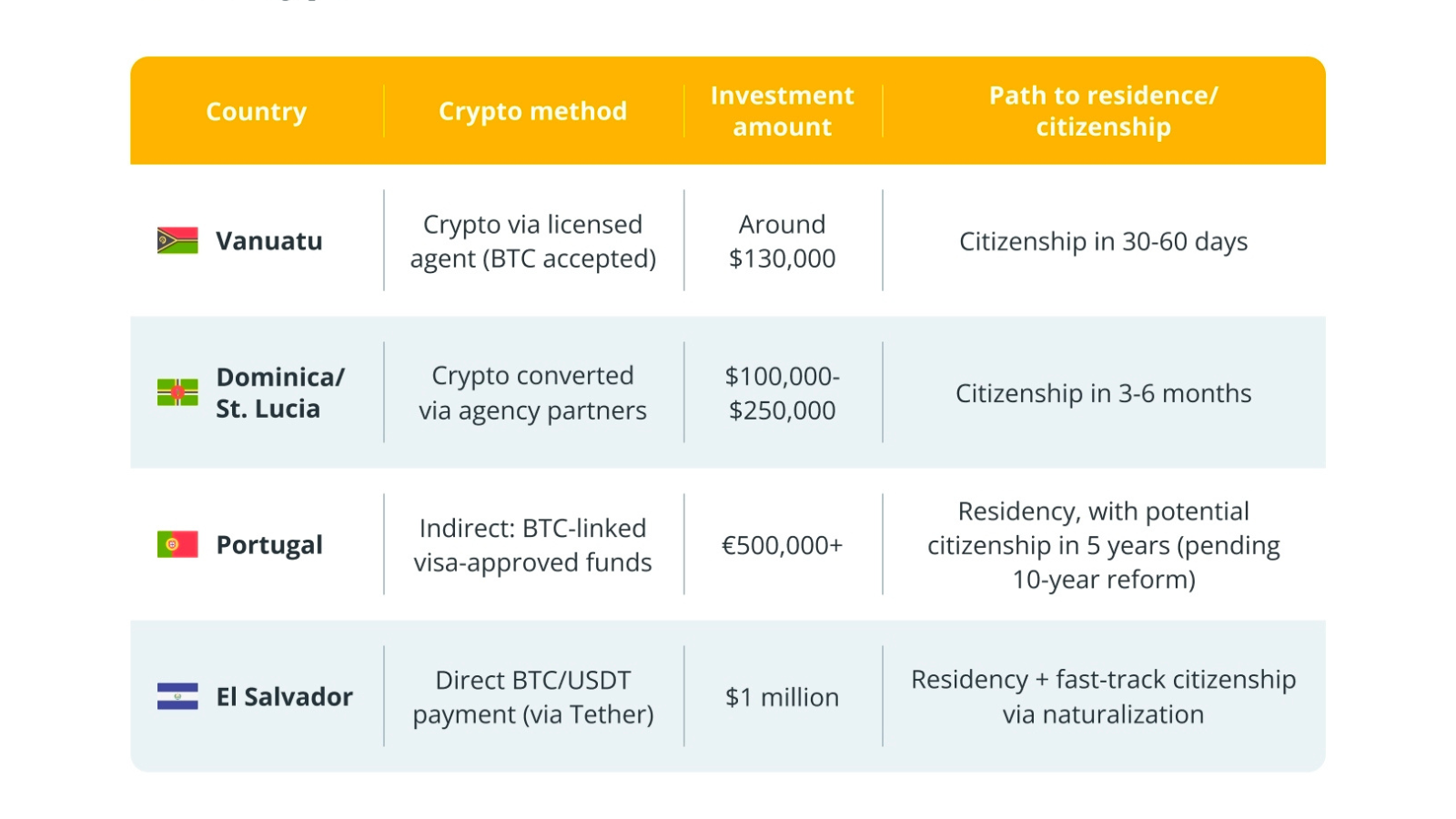 Patru tari permit achizitionarea cetateniei sau obtinerea vizei de aur prin investitii in criptomonede, cu sume ce variaza intre 100.000 si 1 milion de dolari. Vanuatu ofera cetatenie rapida, in 30-60 de zile, prin programul sau oficial, cu posibilitatea de a plati in Bitcoin sau stablecoins prin agenti autorizati. Dominica si Saint Lucia, in Caraibe, asigura cetatenie in cateva luni, acceptand plati in criptomonede prin intermediul agentilor licentiati.