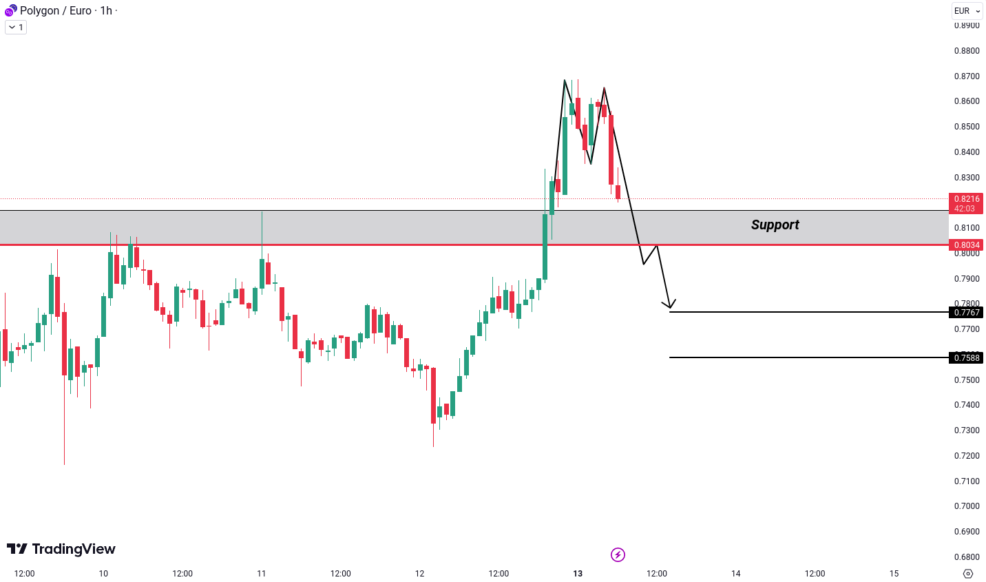 MATIC/EUR formează în prezent un model M distinctiv în intervalul de timp de o oră, cu lumânările roșii indicând un sentiment de vânzare în creștere. Pentru traderii care caută oportunități scurte, MATIC prezintă o opțiune potențială, dar ar fi mai bine să mergem cu trendul. Confirmarea modelului M ar implica o descompunere sub nivelul de suport de 0.8034 Euro. Într-un astfel de scenariu, ne putem seta țintele în jurul valorilor de 0.7767 Euro și 0.7588 Euro.
