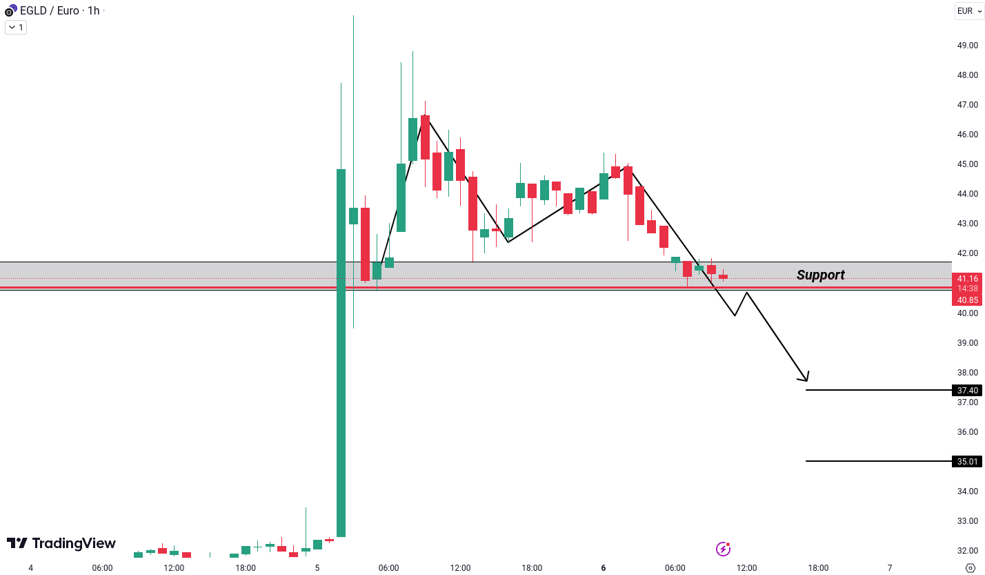 EGLD/EUR arata in prezent formarea unui model M intr-un interval de timp de 1 ora. Un lucru pe care trebuie sa il observati este ca varful drept recent este pozitionat mai jos decat varful stang, prezentand o indicatie mai puternica pentru miscarea bearish. Pentru a valida acest model, este crucial sa observam o scadere sub nivelul de suport de 40.85 Euro, care ne-ar putea determina sa ne setam tintele la 37.40 Euro si 35.01 Euro.