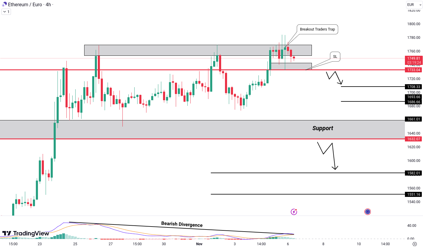ETH/EUR a aratat recent o falsa spargere, indicand ca traderii de breakout sunt posibil prinsi in pozitiile lor. Pe masura ce stop loss-urile lor incep sa se activeze din cauza presiunii de vanzare, ETH poate oferi o oportunitate de vanzare. Tehnic, pretul arata o divergenta bearish pe MACD. Pentru a confirma acest scenariu bearish, este crucial sa observam o scadere sub nivelul de 1,733 Euro, ducand la tintele potentiale la 1,708 Euro si 1,686 Euro. In plus, daca pretul scade sub nivelul de suport de 1,632 Euro, am putea anticipa alte tinte la 1,582 Euro si 1,551 Euro.
