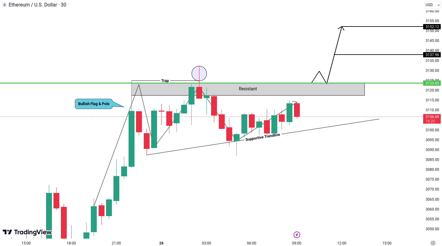 Desi aceste indicatoare sugereaza o perspectiva bullish pentru Ethereum, este important sa asteptam confirmarea inainte de a lua o actiune decisiva. Pentru confirmare, avem nevoie de o spargere peste nivelul de 3,123.98 USD. Aceasta spargere ar putea servi ca un semnal puternic pentru o potentiala miscare ascendenta ulterioara, cu obiectivele proiectate la 3,137.98 USD si 3,152.98 USD, respectiv.
