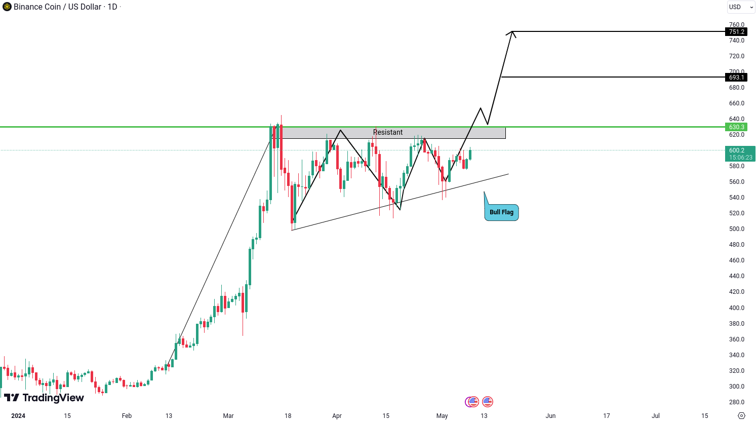 BNB prezinta un model de bull flag, care este de obicei un semnal al unei potentiale continuari a trendului actual de crestere. Acest model sugereaza ca piata ar putea relua traiectoria sa ascendenta dupa o perioada scurta de consolidare.