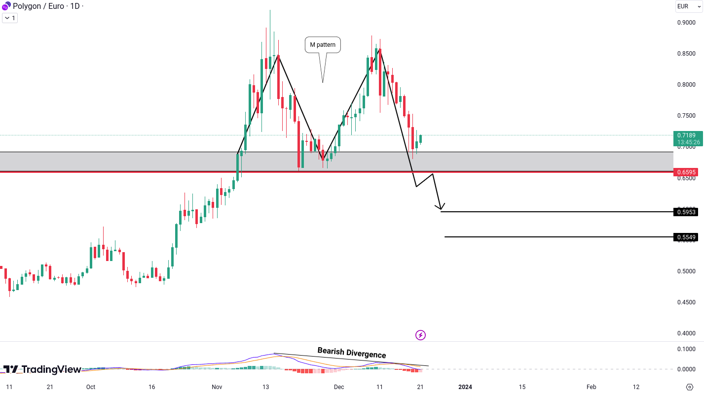 MATIC/EUR formează un model M cu divergență bearish pe indicatorul MACD. Acestea se aliniază pentru a sugera o probabilitate crescută a unei mișcări bearish. Pentru a confirma acest trend potențial, suntem sfătuiți să monitorizăm îndeaproape o descompunere sub nivelul de 0.6595 Euro. Dacă se întâmplă acest lucru, ar putea deschide calea către ținte la 0.5953 Euro și 0.5549 Euro.