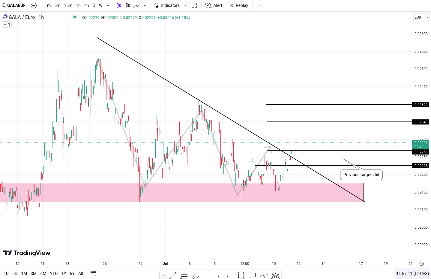 GALA continua sa impresioneze traderii, atingand obiectivele anterioare si iesind dintr-un model triunghiular. Aceasta evolutie indica o posibila crestere a optimismului, cu urmatoarele obiective proiectate la 0.02349 Euro si 0.02399 Euro. Traderii care detin deja GALA pot anticipa o miscare ascendenta continua si ar putea lua in considerare ajustarea pozitiilor lor in consecinta.