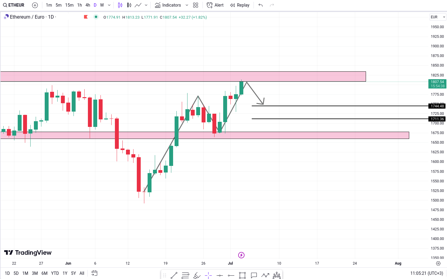 Daca ETH/EUR intr-adevar experimenteaza o inversare bearish in apropierea zonei de rezistenta, exista obiective potentiale de scadere la nivelurile de 1,744 Euro si 1,711 Euro. Aceste niveluri reprezinta zone in care s-ar putea manifesta o presiune suplimentara de vanzare, determinand o scadere a valorii Ethereumului fata de Euro.