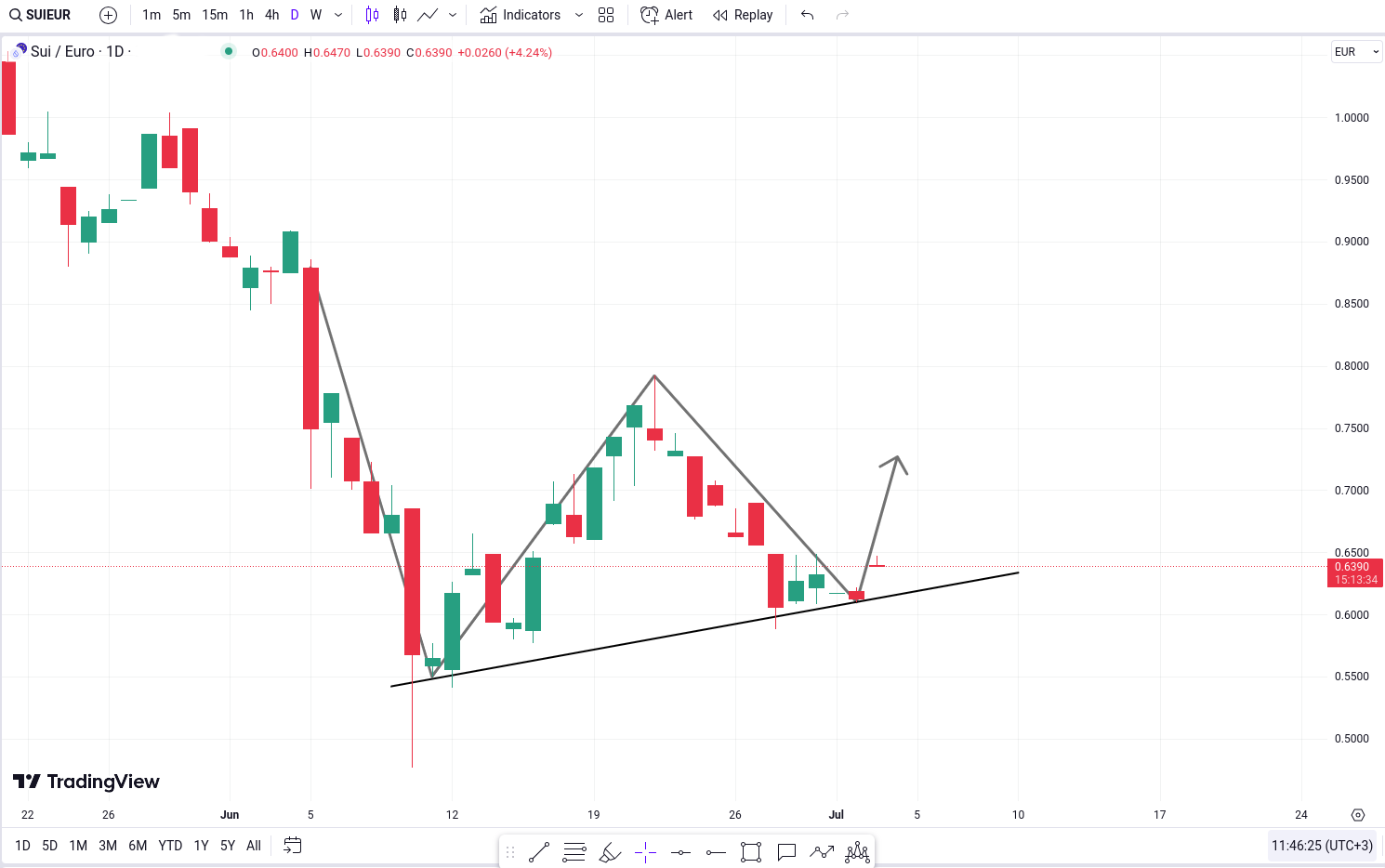 SUI/Euro se afla in prezent aproape de o linie de tendinta semnificativa, sugerand posibilitatea gasirii unui suport la acest nivel si potentiala inversare a directiei sale.