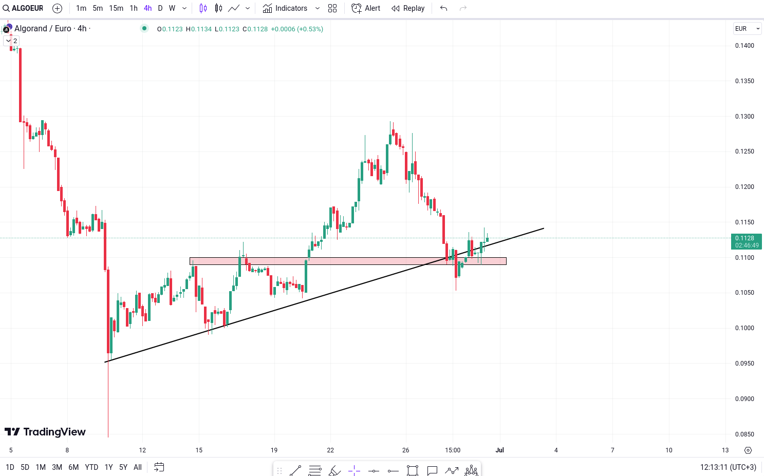 ALGO/Euro prezinta lumanari bullish in apropierea liniei de trend bullish (bullish trendline) si a zonei de cerere (demand zone).