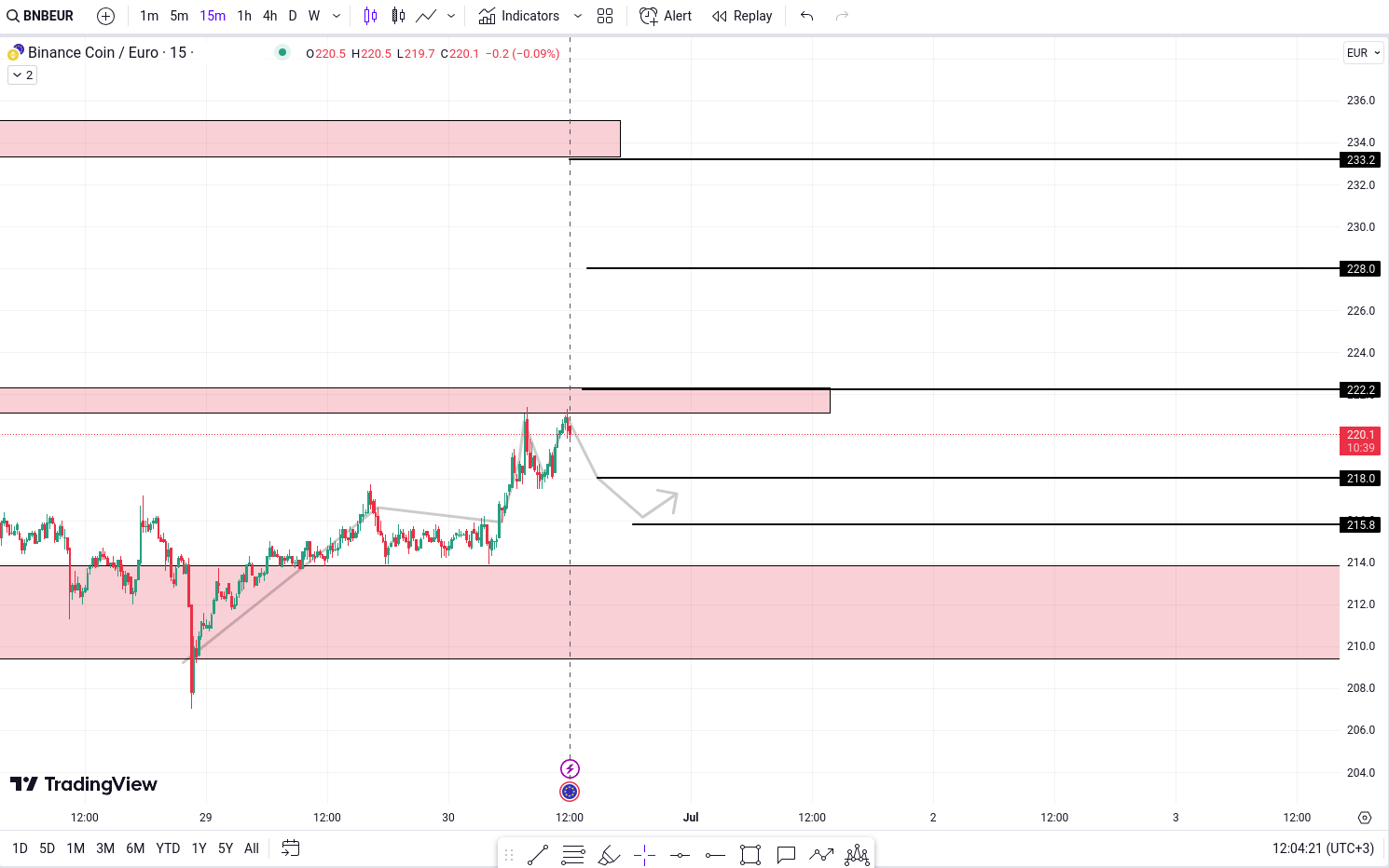 Pretul BNB se apropie in prezent de o zona de rezistenta. Daca pretul da semne de inversare din aceasta zona, acest lucru ar putea indica o posibila miscare bearish. Intr-un astfel de scenariu, putem identifica doua tinte posibile in jos. Prima tinta ar fi in jurul valorii de 218 Euro, iar cea de-a doua tinta ar fi in jurul valorii de 215 Euro. Aceste niveluri reprezinta zone in care pretul ar putea gasi suport in timpul miscarii descendente asteptate.