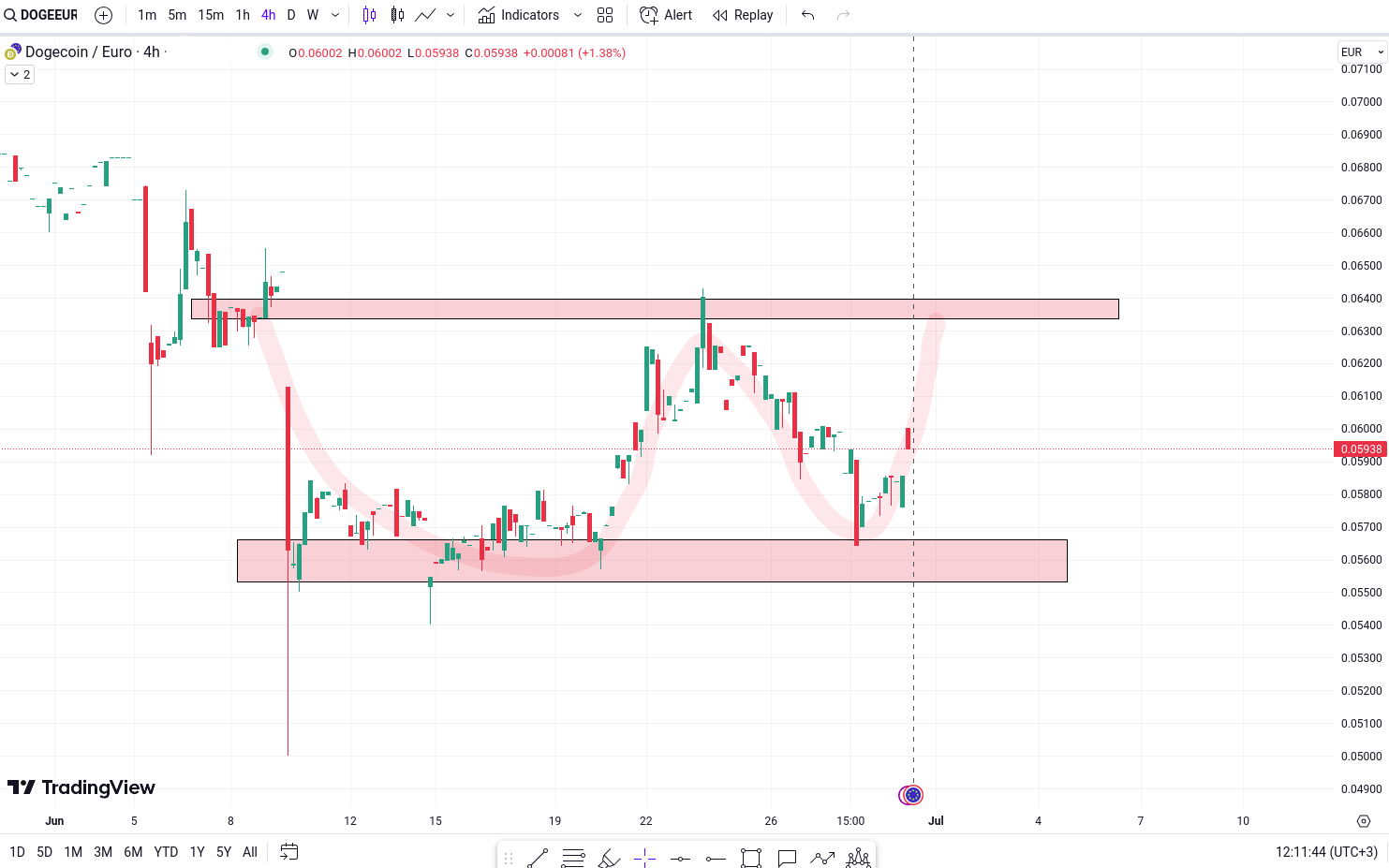 Pe graficul Doge/Euro putem observa formarea unui model de tip W, ceea ce indica o posibila miscare bullish.
