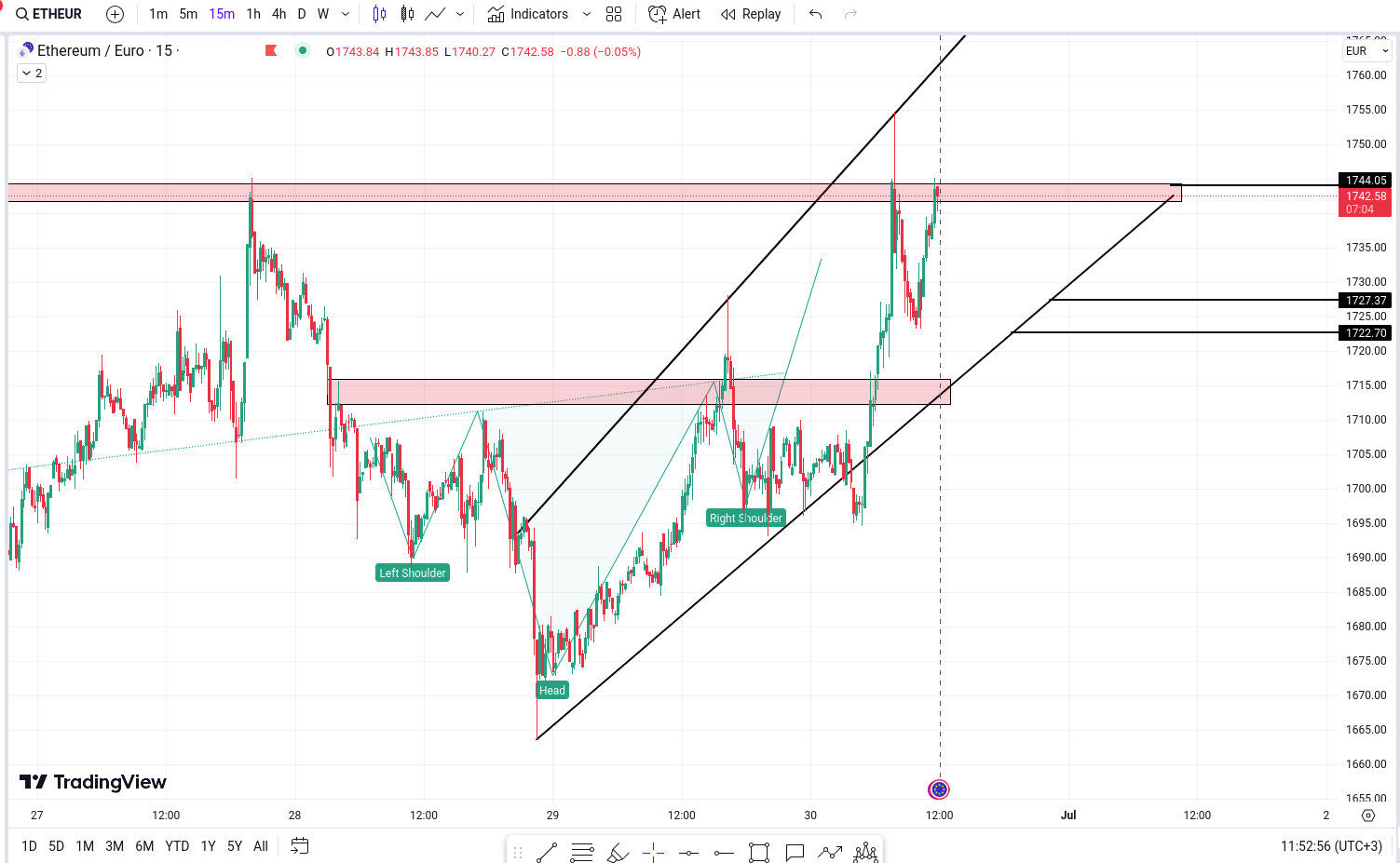 Pe graficul ETH/EUR putem observa formarea unui potential model de inversare. Pretul a dat semne de reversare de la nivelul de 1,744 Euro, constituind un model de ascensiune in forma de pana (rising wedge pattern). Acest model indica adesea o posibila inversare a trendului de la bullish la bearish.