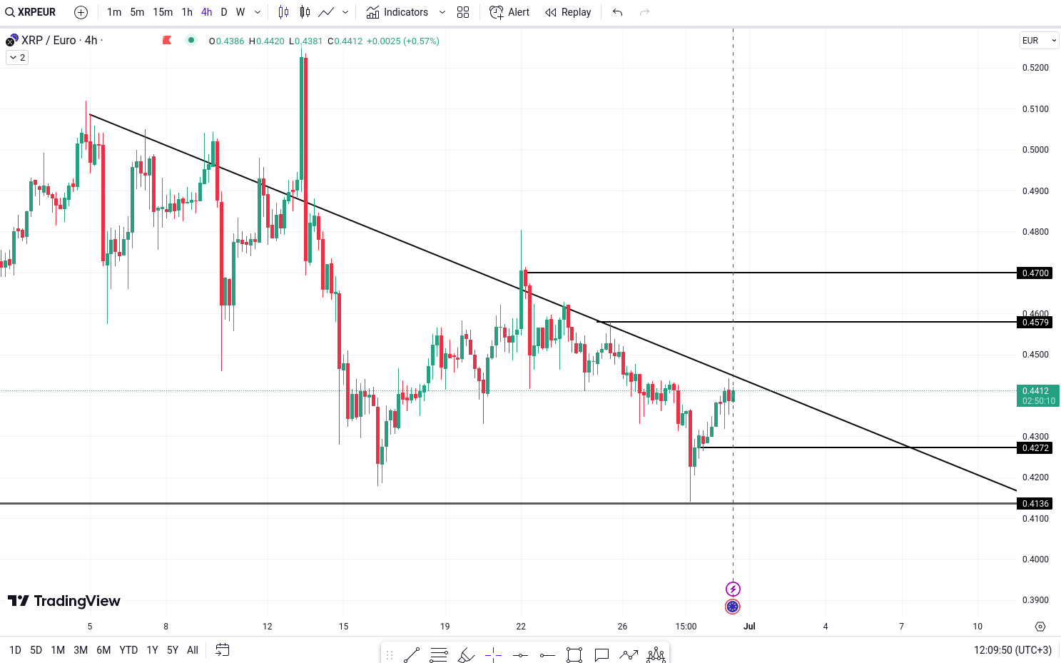 Pe graficul XRP/Euro putem observa ca pretul se apropie in prezent de o linie de trend bearish. Daca pretul manifesta o inversare de la acest nivel, acest lucru ar putea indica o posibila miscare descendenta.Intr-un astfel de scenariu, putem identifica doua posibile tinte in jos. Prima tinta ar fi in jurul valorii de 0.4272 Euro, urmata de a doua tinta in jurul valorii de 0.4136 Euro. Aceste niveluri reprezinta zone in care pretul ar putea gasi suport in timpul miscarii descendente anticipate.