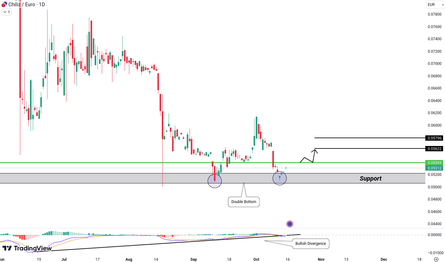 CHZ/EUR prezinta in prezent o actiune pret bullish datorita formarii unui dublu fund si a divergentei bullish in indicatorul Moving Average Convergence Divergence (MACD). Daca se rupe deasupra nivelului de 0.05422 Euro, putem anticipa tinte care ajung pana la 0.05622 si 0.05796 Euro.