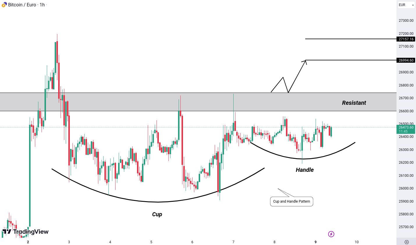 BTC/EUR formeaza un model interesant pe graficul sau de o ora: modelul cup and handle. Acest model sugereaza o tendinta bullish pe termen scurt, ceea ce este incurajator pentru traderii care cauta oportunitati bullish.