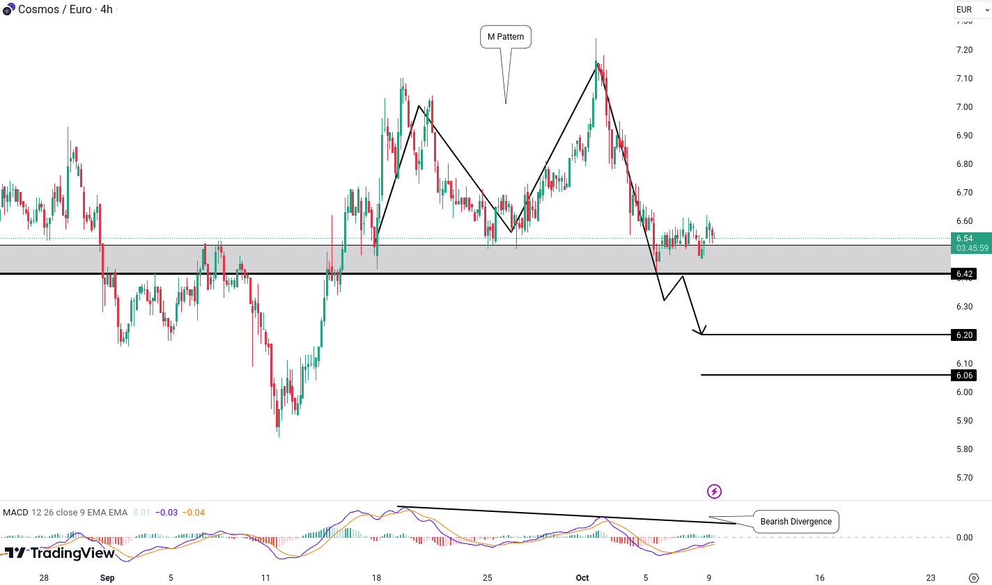 ATOM/EUR se confrunta in prezent cu o tendinta bearish, iar pe intervalul de timp de 4 ore, formeaza un model “M”. Acest model poate fi indicativ pentru o posibila miscare descendenta a preturilor.