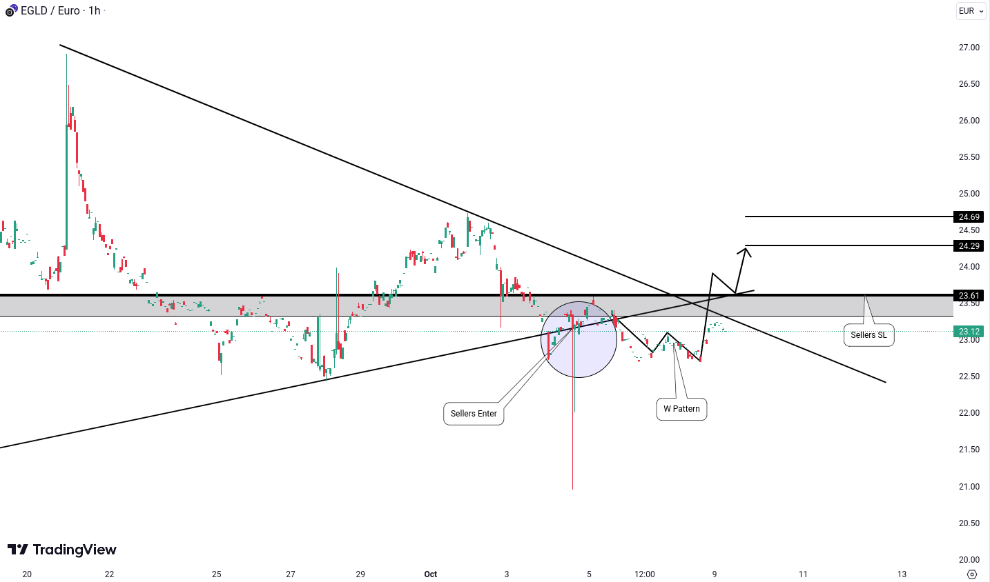 EGLD/EUR a afisat recent o actiune de pret traped. Acesta a rupt initial sub linia de trend inferioara a unui model de triunghi cu o lumanare rosie mare, indicand o crestere a activitatii de vanzare. Cu toate acestea, ceea ce face interesanta aceasta situatie este consolidarea pretului.