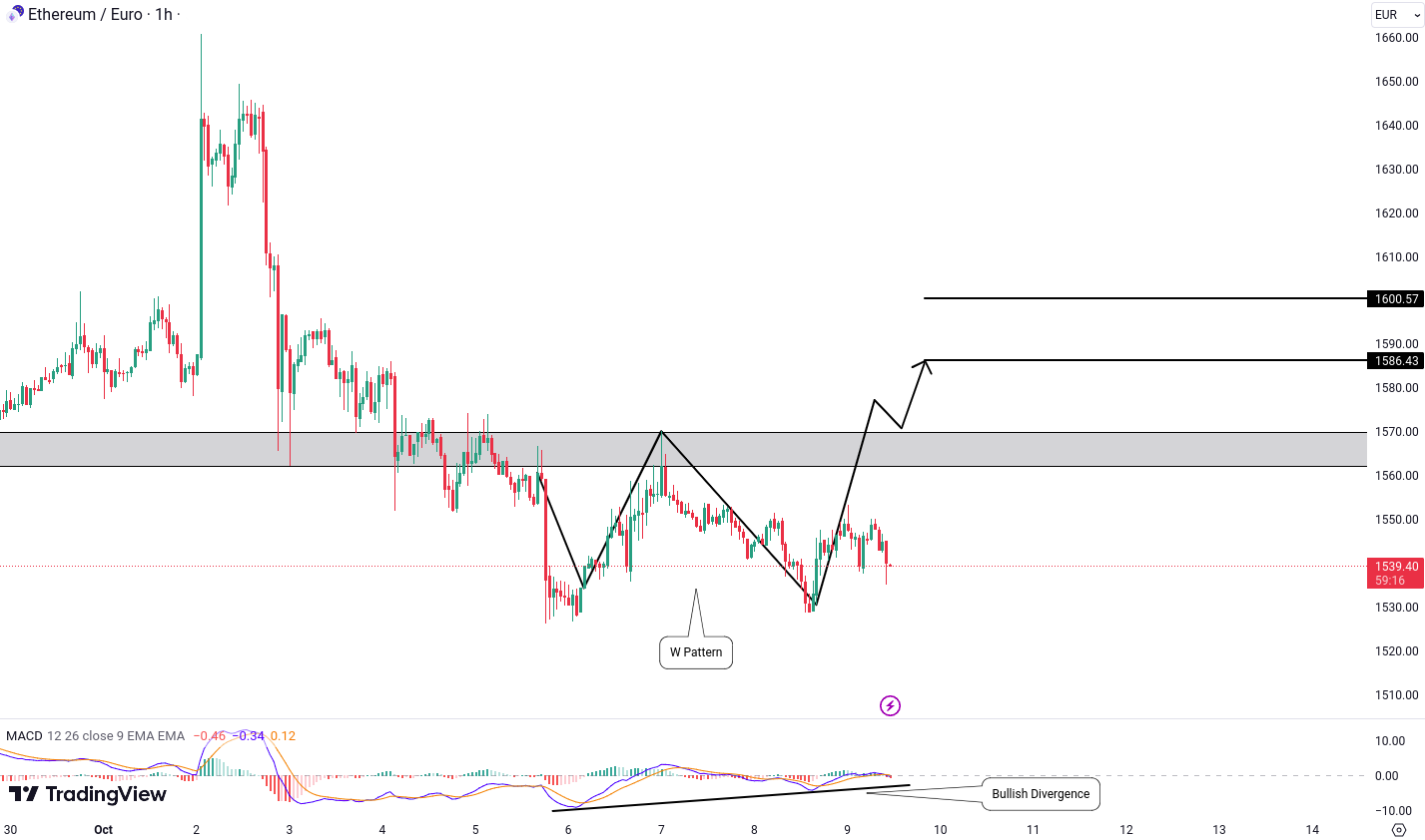 Graficul de o ora al ETH/EUR dezvaluie un model W, cunoscut si sub numele de double bottom, insotit de o divergenta bullish in MACD. Ambele aceste modele sunt indicatori bullish, sugerand o perspectiva pozitiva pentru pereche.