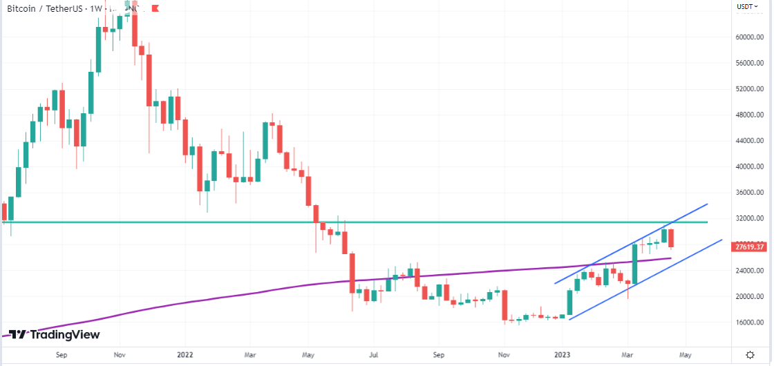 Daca la inceputul saptamanii, Bitcoin se tranzactiona la niveluri de peste 30.000 USD, pe parcursul zilelor ce au urmat, cel mai important crypto-activ a coborat treptat, ajungand sub nivelul de 28.000 USD.