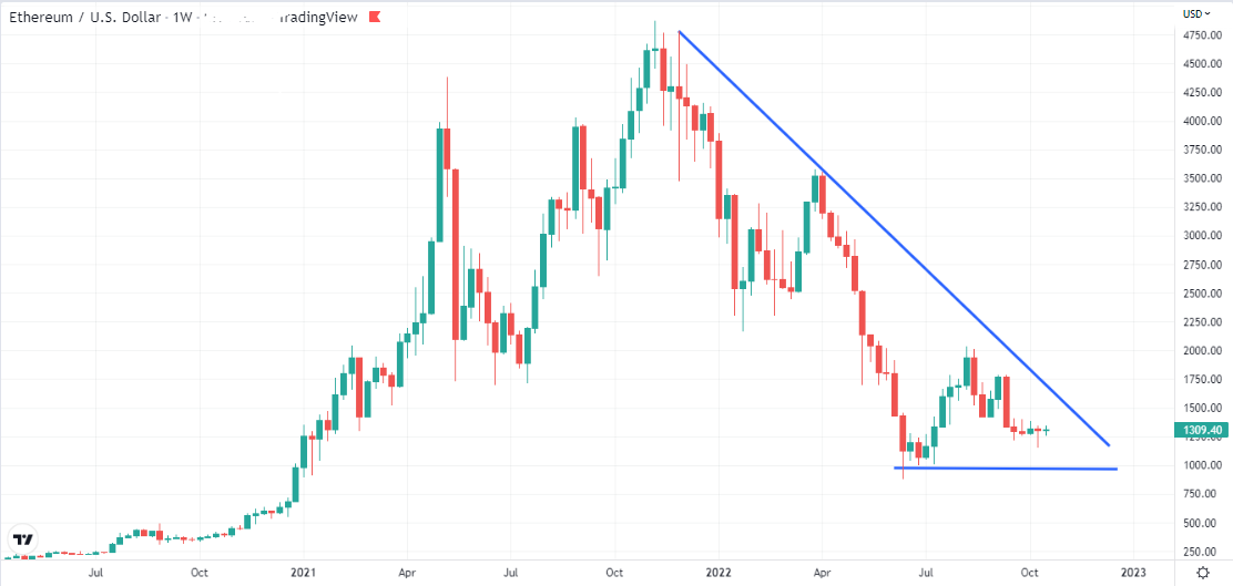 ETH s-a tranzactionat lateral si in saptamana recent incheiata, fara directie clara si fara sa vedem miscari majore, astfel incat “lumanarea” de formare a pretului pe graficul saptamanal este cea mai mica din anul 2022.