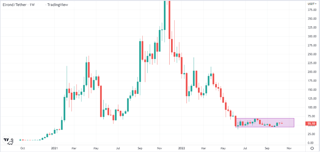 Apatia din piata s-a rasfrant si asupra tokenul retelei Elrond si observam pe graficul de pret o “lumanare” saptamanala aproape inexistenta, semn al lipsei de directie.