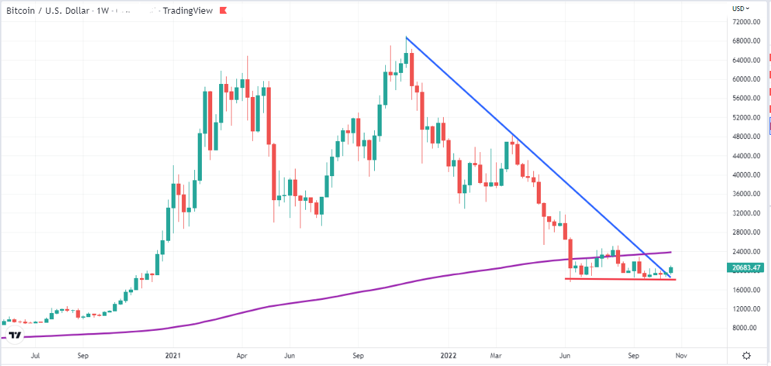 BTC a reusit sa treaca peste linia de trend descrescator inceput in luna Noiembrie 2021, pe fondul sentimentului optimist care s-a transpus din bursele de actiuni, in piata crypto.