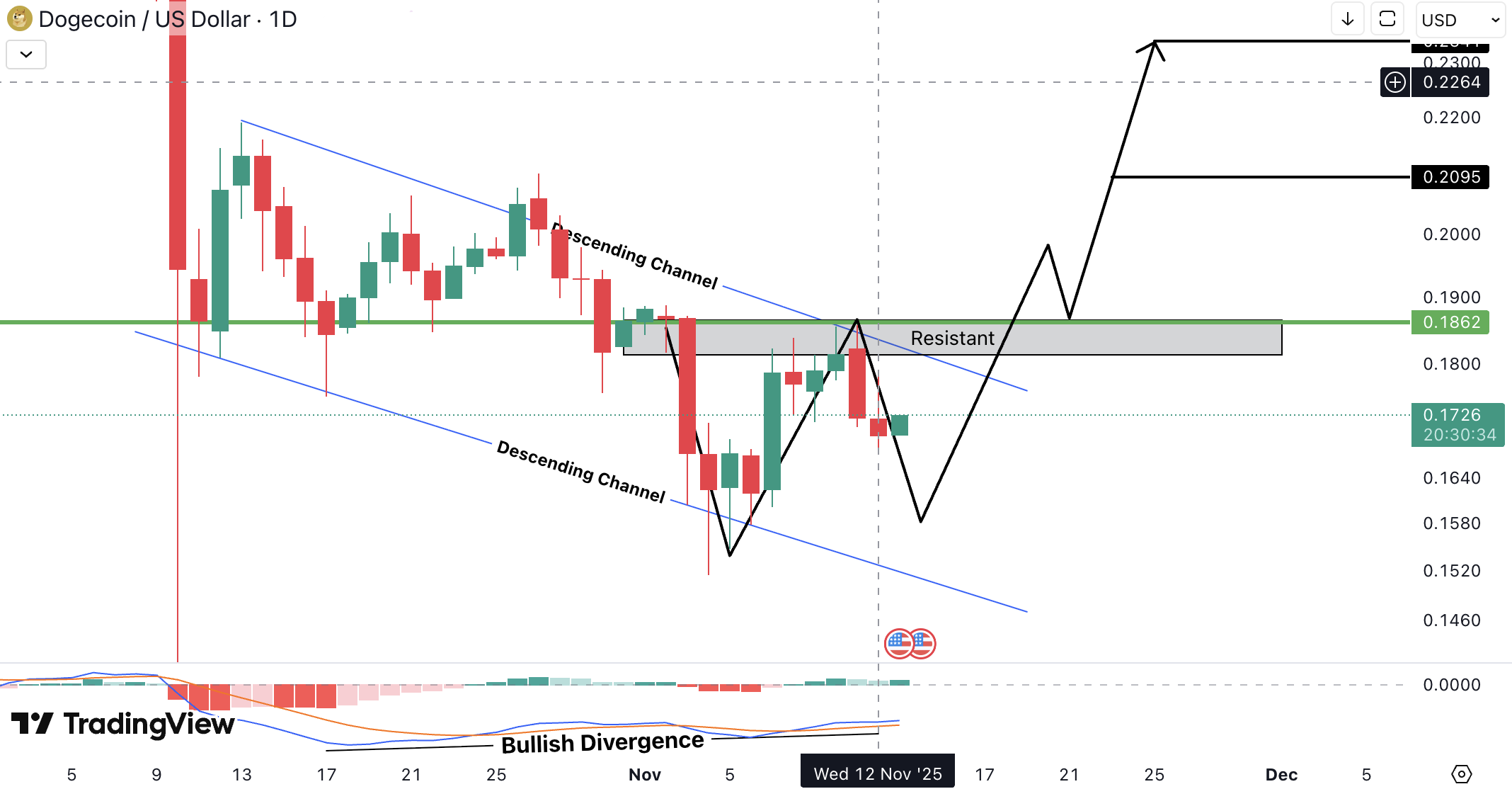 DOGE is following a descending channel and may break out after forming a W pattern. It is also showing bullish divergence, which together increases the probability of a bullish move. For confirmation, we need a breakout and candle close above the resistance zone at 0.1862 USD. If confirmed, we can expect upside targets at 0.2095 USD and 0.2341 USD.