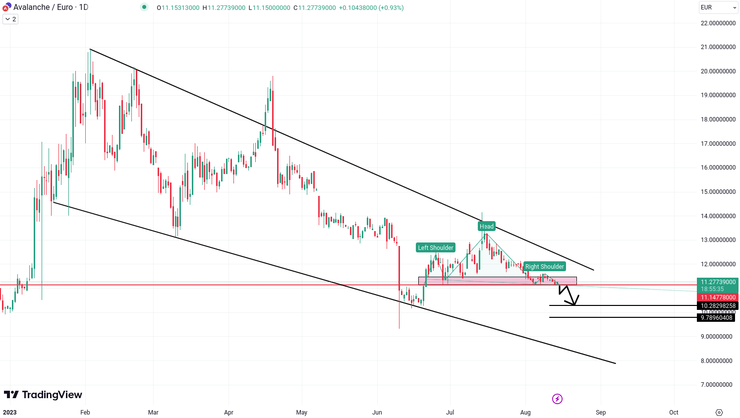 AVAX/EUR is in the process of forming a head and shoulders pattern near the upper trendline of a falling wedge pattern, similar to LTC, and is following the same bearish price action.