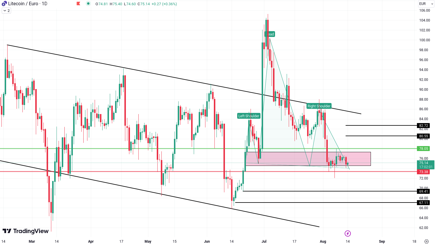 Conversely, if LTC/EUR defies the bearish signals and manages to breach the resistance zone around 78.05 Euro, it could signal the onset of bullish momentum. This could drive the price toward targets at 80.55 Euro and 82.72 Euro. Nevertheless, the prominence of the head and shoulders pattern, coupled with the upper trendline of the falling wedge, lends greater weight to the bearish outlook.