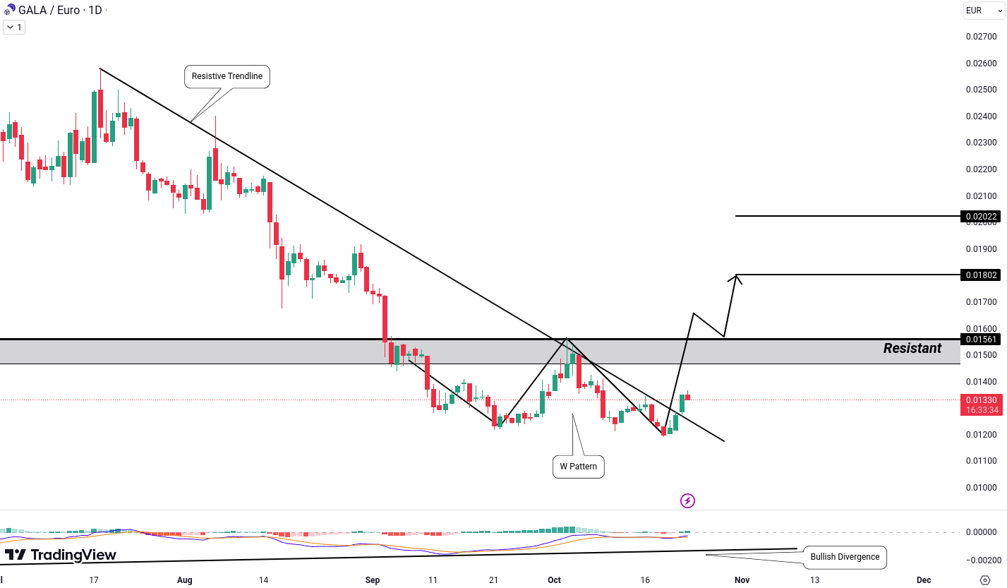 GALA/EUR has recently broken the resistive trendline, providing a boost to the confidence of the bulls. It seems to be aligning with the price action of ETH and EGLD, forming a W pattern with bullish divergence. To capture this potential bullish movement, we’ll be looking for a breakout above the 0.01561 Euro level, which might signal targets at 0.01802 Euro and 0.02022 Euro.