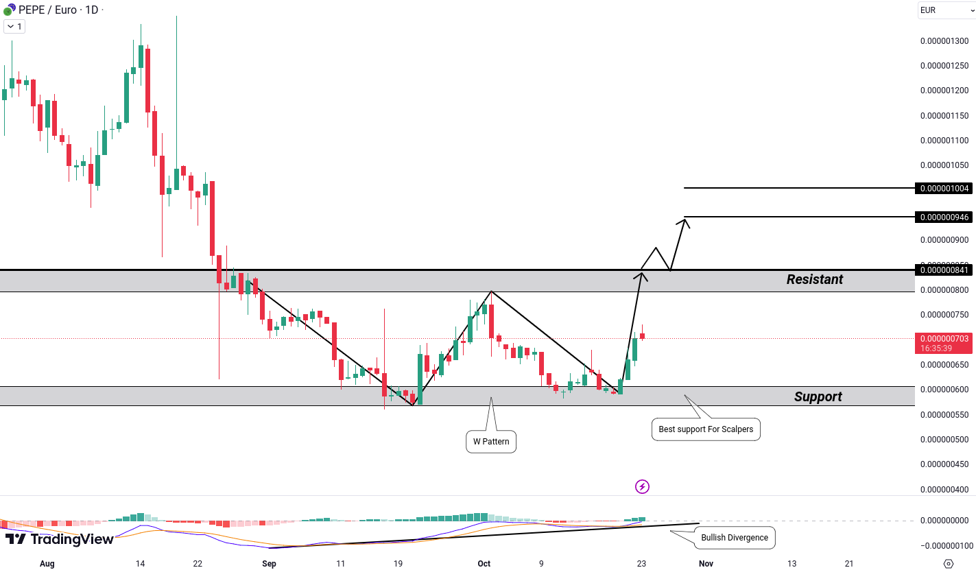 PEPE/EUR also follows the same price action as ETH.PEPE is also shaping a W pattern with bullish divergence. A potential breakout above the 0.000000841 Euro level might indicate further gains, with targets at 0.000000946 Euro and 0.000001004 Euro.