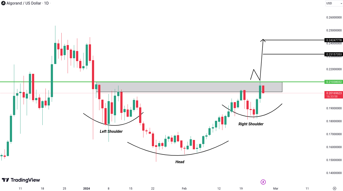 ALGO/USD is forming an “inverse head and shoulders” pattern, indicating a potential shift from a bearish market structure to a bullish one. This pattern is widely recognized in technical analysis as a bullish reversal formation, suggesting a change in market sentiment.