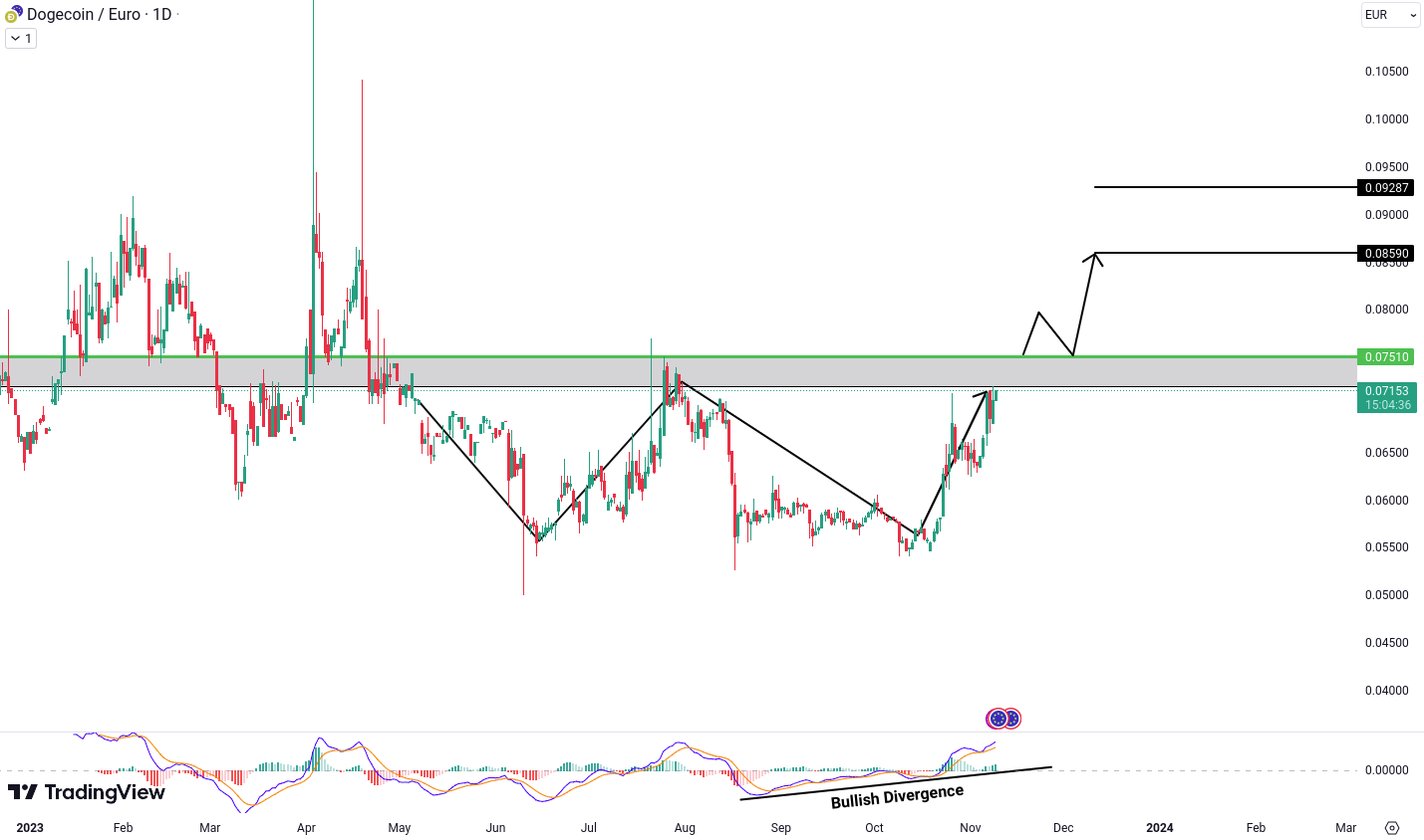 DOGE/EUR is currently shaping a W pattern, along with bullish divergence in the daily timeframe. This shift from a trend of lower lows to higher highs indicates a potential reversal. Additionally, the bullish divergence indicates increasing volumes despite the price remaining in a particular zone. To confirm this pattern, we would need a breakout above the level of 0.07510 Euro, potentially leading to targets of 0.08590 Euro and 0.09287 Euro.