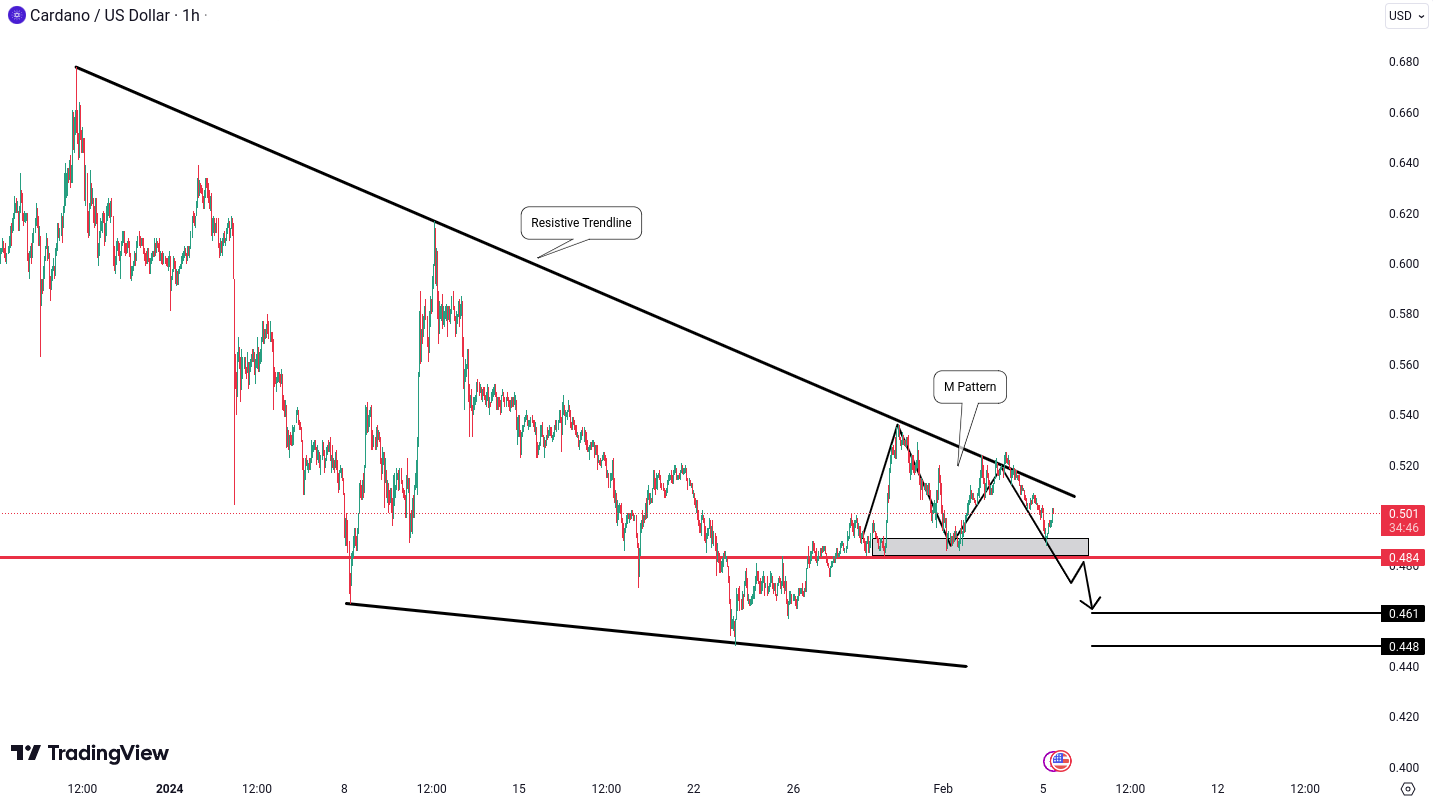 ADA/USD is currently indicating a potential bearish move with a lower probability setup. The formation of an M pattern on the resistive trendline suggests a bearish signal. To confirm this pattern, weβll be watching for a breakdown below the level of 0.484 USD. If this occurs, it could open the door to targets around 0.461 USD and 0.448 USD.