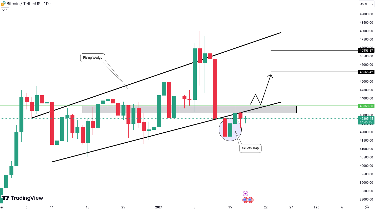 BTC/USD is showing signs that it might be attempting to trap sellers who entered on the breakdown of the rising wedge. Typically, selling always comes fast, but this time the price is consolidating after the breakdown. To confirm this scenario, We are waiting for the price to move above the level of $43,558. This confirmation could set the stage for potential targets at $45,566 and $46,853, possibly driven by stop-loss hunting.