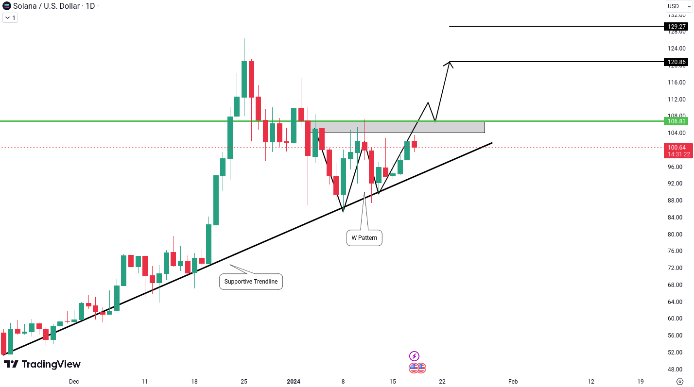 SOL/USD is currently forming a W pattern within the supportive trendline in the daily timeframe. This pattern is boosting the probability of a bullish movement. To confirm this optimistic scenario, We need a breakout above the critical level of $106.83. If this breakout unfolds, it could set the stage for potential targets at $120.86 and $129.27.