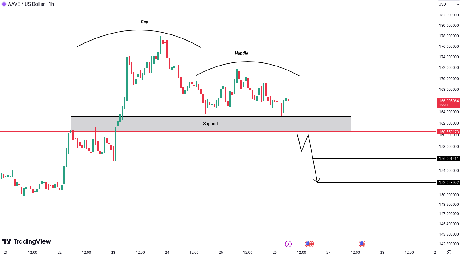 Aave (AAVE) is currently showing us a falling wedge pattern. This pattern typically indicates a bullish reversal but there’s a catch. The price is hovering near the upper trendline of this wedge which could act as resistance.