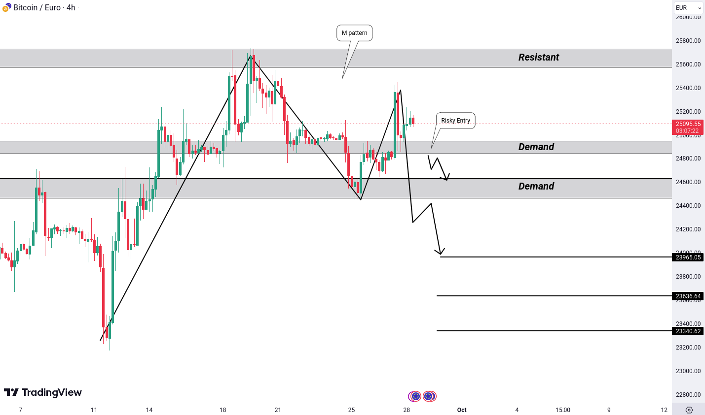 Let’s take a fresh look at BTC/EUR and the current scenario on its 4-hour chart. Previously, we discussed the possibility of a breakdown, but as the market evolves, we now observe the formation of a bearish M pattern near a resistance area.