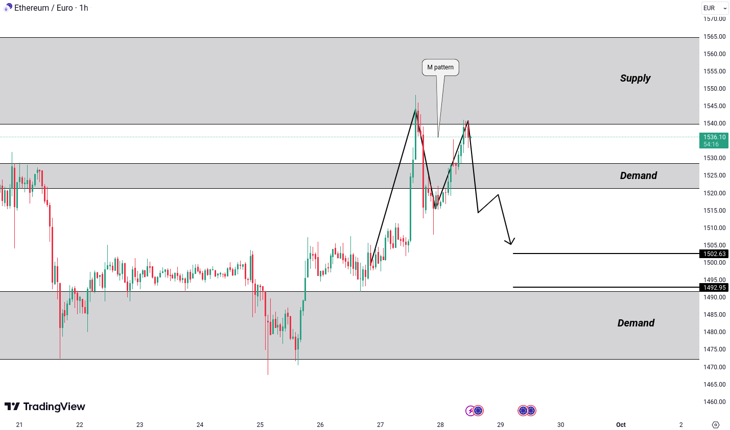 ETH/EUR recently hit our previous bullish targets from the demand area. However, it is now near a supply zone and forming a bearish “M” pattern on the hourly timeframe. A breakdown below 1,519 could lead to potential targets at 1,502 and 1,492.