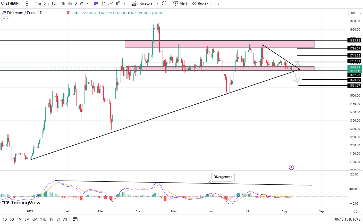 Intervalul de consolidare, cuprins intre 1,833 Euro si 1,671 Euro, este o zona critica in care miscarea pretului a fost limitata. Daca ETH reuseste sa depaseasca linia de tendinta de rezistenta, acest lucru ar putea declansa o miscare bullish pe termen scurt. Prima tinta ar putea fi in jurul valorii de 1,700 Euro , un nivel psihologic important. Ulterior, alte nivele tinta ar putea fi identificate la 1,743 Euro  si 1,786 Euro , respectiv.