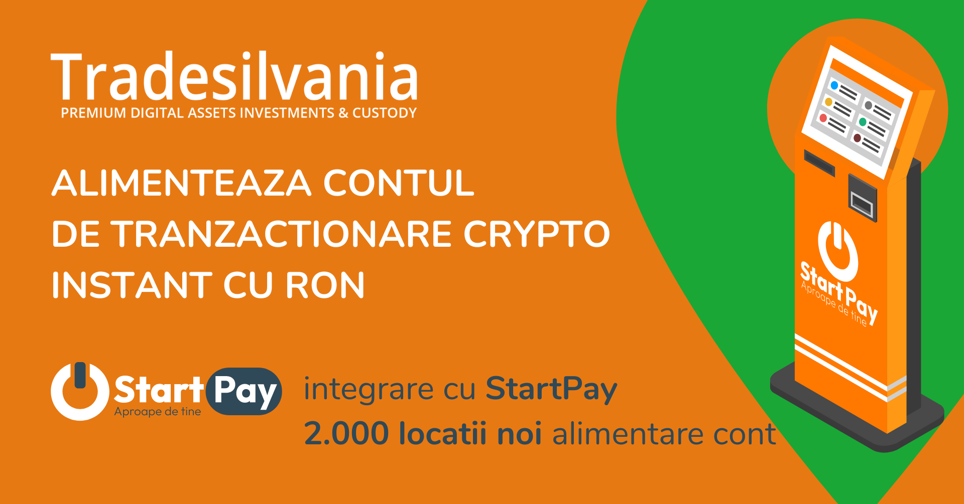 Tradesilvania.com, platforma premium de investitii in criptomonede, dezvolta modalitatile de alimentare a contului de client printr-un parteneriat cu reteaua Start Pay Romania care ridica numarul de locatii de alimentare la peste 22.000 in toata tara. Prin aceasta noua colaborare, utilizatorii Tradesilvania vor putea accesa oricare din cele 2.000 automate de plata StartPay in vederea alimentarii instant a contului de tranzactionare cu RON.