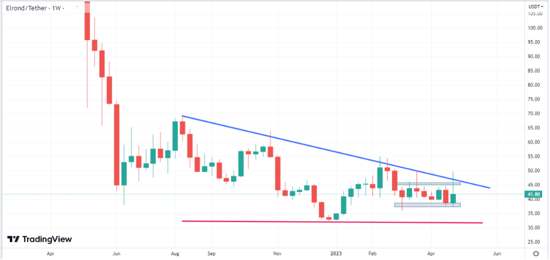 At the end of the week, eGold’s price returned below the downward trend line created in August 2022 and within the neutral trading zone of the last 8 weeks. For EGLD to enter an upward trend, it must rise above the $50 with conviction and break through the downside trend line decisively.