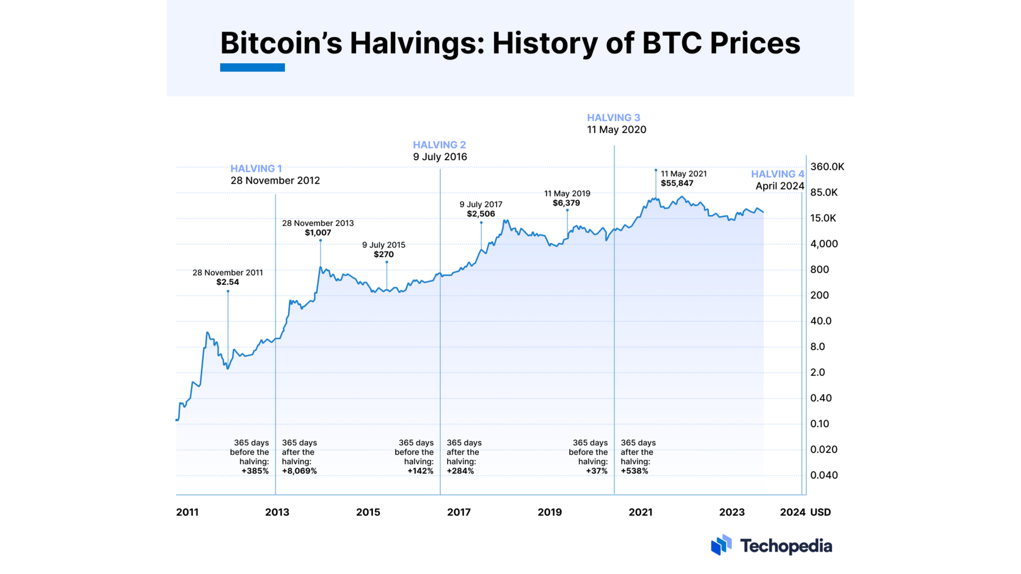 The first halving occurred on November 28, 2012. At that time, the block reward decreased from 50 BTC to 25 BTC per block. The price of Bitcoin on that day was only $12.20. Surprisingly, this event marked the beginning of Bitcoin’s rapid growth.